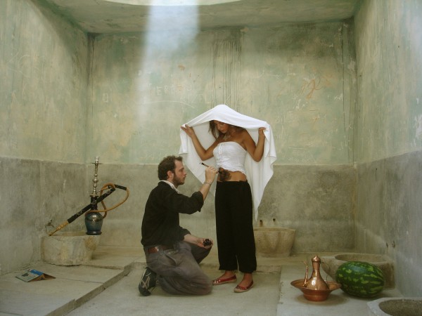 – Anadolulu bir kadın üzerine bir Metragram, tarihi Sinop hapishanesinin hamamı, Karadeniz kıyıları, Türkiye: “Dünyaya geliş, bir kişinin doğumu ve ilk yıllarının genel zamanı ve mekanıdır. Hristiyanlığın etkileri nedeniyle bu terim; -en azından Batı uygarlığında- Hristiyanların tek kelimeyle “Doğuş” olarak adlandırdığı İsa’nın doğumuyla güçlü bir ilişkiye tekamül ediyor. Terim, kişinin anayurdu, dili, siyasi sistemi ve ortamında olduğu gibi özel ve genel durumu saptamak için kültürel mal etmeye de uygulanabilir. Bu bağlamda, bir kişinin dünyaya gelişi, ulusal köken veya ırka dayanan genel izlenim için bir temel oluşturmak üzere anlamlandırılır (veya yanlış anlam- landırılır).” Wikipedia.org, “Dünyaya geliş” üzerine yazılmış makaleden alıntı. Dolayısıyla Metragram (veya Matrigrafi) olarak nitelendirdiğim ve bir kadının alt karnı (rahim) üstüne tek renkli siyah mürekkeple yazı yazılmasından oluşan bu kaligrafik müdahale, Yves Klein’ın Antropometrileri, Christian Dotremont’un Logogramları ve Piero Manzoni’nin Daktilogramları ile bağdaştı — tabula rasa, pinakis agraphos (boş levha, temiz bir sayfa). Yazmanın çelişkisi üzerine düşünen amphigory (anlamsız yazma), bir Metragram, belirli bir coğrafi ve etnolojik alanı, o dünyanın kökenine sembolik bir mürekkep sürmeyle “yazmaya” meyleder.