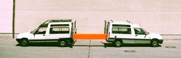 Birbirine benzer iki araba geometrik bir gövde aracılığıyla gevşek bir şekilde birbirine bağlıdır.