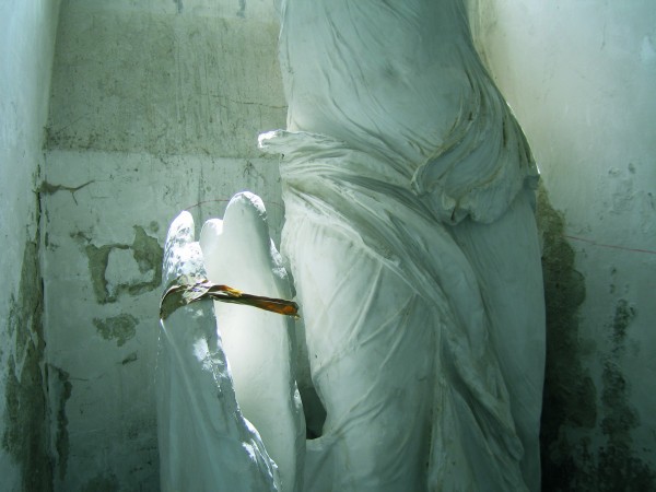 Yunan mitolojisinde Zafer Tanrıçası Samothrace’lı Nike Heykelinin odanın yerine, duvarlarına ve tavanına yerleştirilmiş fotoğraşarı. Fotoğrafta tanrıçanın kanatları bedeninden ayrılmış. İkisi birbirine bantla iliştirilmiş. Heykeli bu şekilde Münih Güzel Sanatlar Akademisi arşivinde bulmuştum. Fotoğraşarını çektim ve onları yerleştirmem için kullandım. Kanatları olmadan Nike efsanevi gücünü kullanma kudretinden yoksun görünüyor. Sabahattin Ali’nin Sinop’taki tutukluluğu hakkındaki ünlü şiiri “Aldırma Gönül”den bir alıntı. Özlenen denizi görmek için gökyüzüne bakmayı öneriyor. Karadeniz kıyısına çok yakın olduğunuz halde hapishane alanının içinden sadece sesini duyabiliyor, onu asla göremiyorsunuz. Şiir odanın zemininde yazılı sunuluyor. Güney Bavyera’daki “Mangfall” nehrinin çağlama sesini içeren bir açık hava kaydı. Mangfall nehri korunmuş bir doğa bölgesinde yer alıyor ve temiz suyuyla tanınıyor.