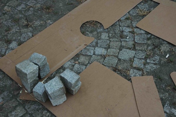 Merkez avluda olanakları kısıtlı tutsaklık ortamında ortaya çıkmış, sınırlı ve birbirine bağımlı kütlelerin demonstre edilişi kırılgan ahşap tekerlekler ve demir parmaklıklı dingil ile oluşturulmuş, hareket olgusu yaratmak amacıyla (hapishanenin manzarasına gönderme olarak) uzun lastiklerle esneklik ve kısıtlama birarada kullanılmıştır.